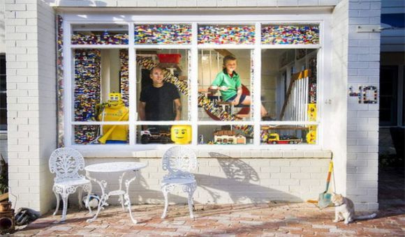 O caminho de entrada para a casa do Sr. Bigg Wither - Turner tem tubos de Lego correndo pelo corredor, e cabeças de Lego gigantes na janela.